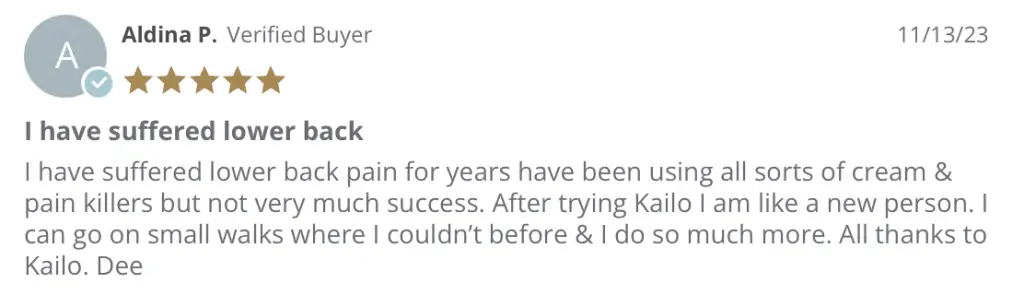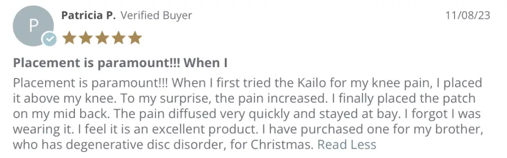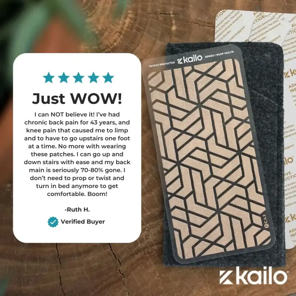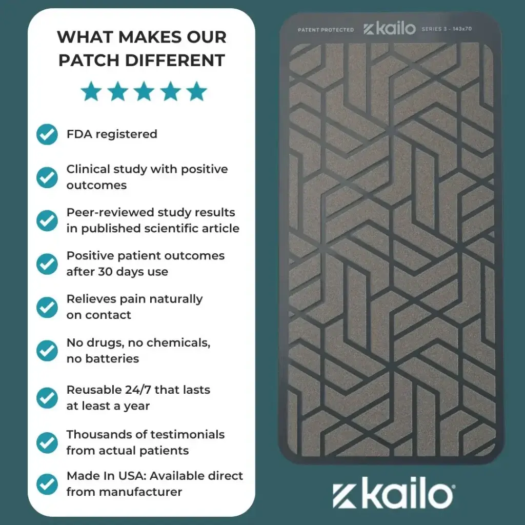 Kailo is far more than just a business for us, it’s changed thousands of lives already. We offer a no-hassle, 100% money-back guarantee. If your Kailo™ pain patch isn’t working for you within 90 days, we’ll gladly take it back. Before returning The Kailo™, we would love a chance to make sure you’ve found the correct placement. Over 90% of our customers have found an increase in comfort. Our goal is to help everyone get relief. Please contact us at support@gokailo.com. For specifics on our return policy, please click here.